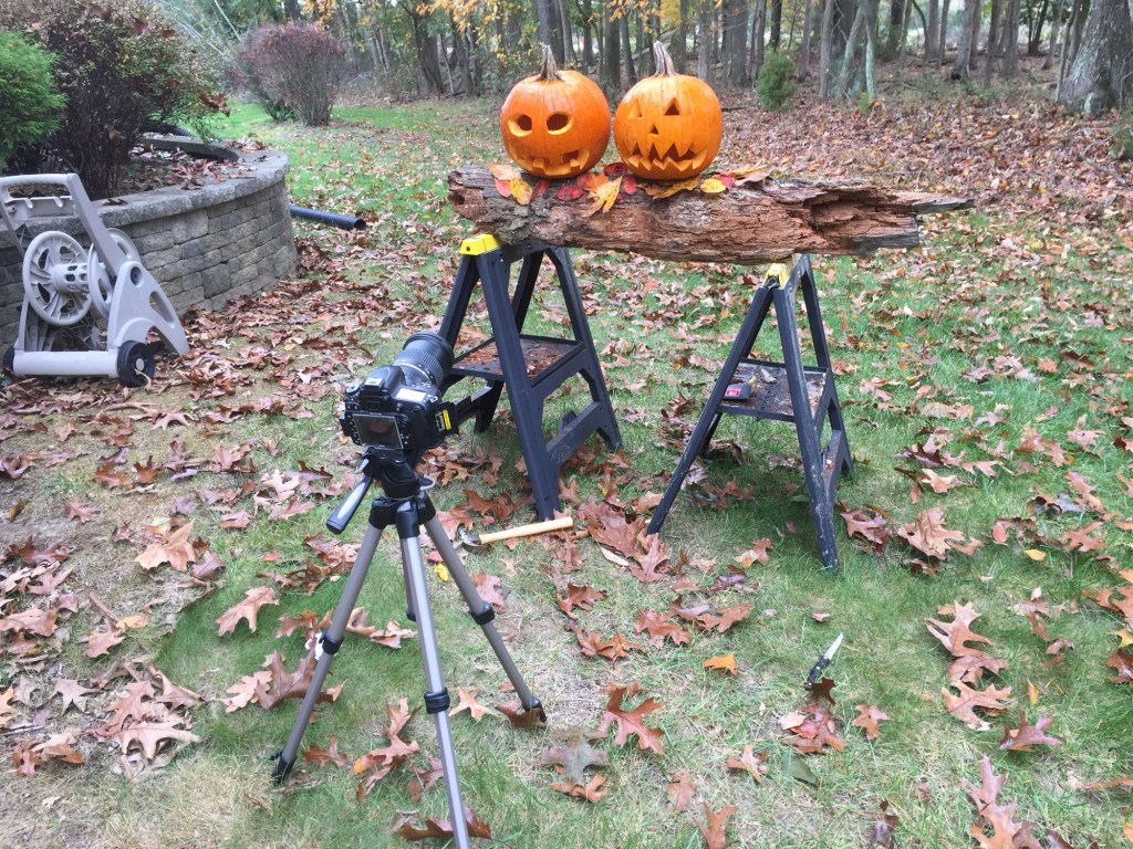 Leaves are, well, up in trees. So the only way to do what I wanted was to get a log and elevate it so I could have the pumpkins above the camera so that I could get the leaves in the background. I used sawhorses for that purpose and actually had to tilt the pumpkins forward, which, with the camera below them, created the illusion that they were actually level. I then added a few leaves to the log. I zoomed in close to crop out everything but the capture I wanted. Here is what it looked like in reality:
