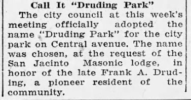 Did you know there is a park in California named after the Drudings? It is called “Druding Park” in the City of San Jacinto, CA, near LA. It was named after Frank A. Druding, who was born in 1854 in Philadelphia, his parents being German born.